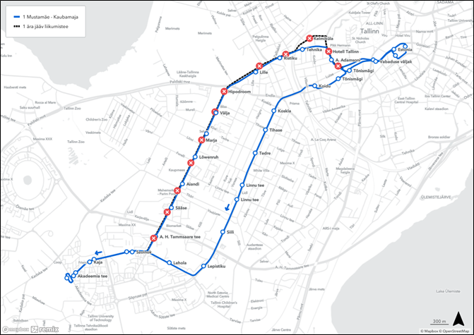 ❌ ära jäävad peatused: Lille, Ristiku, Tehnika, Toompark, Balti jaam ja Kelmiküla ära jäävad peatused: Toompark, Balti jaam (mõlemal suunal), Kelmiküla, Tehnika (Mustamäe suunal) ja Endla