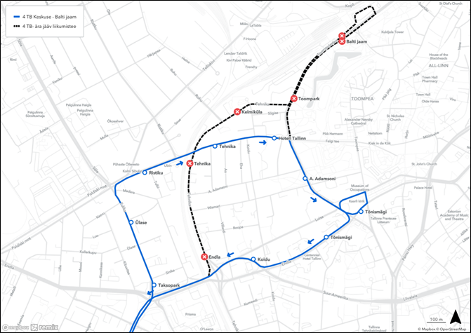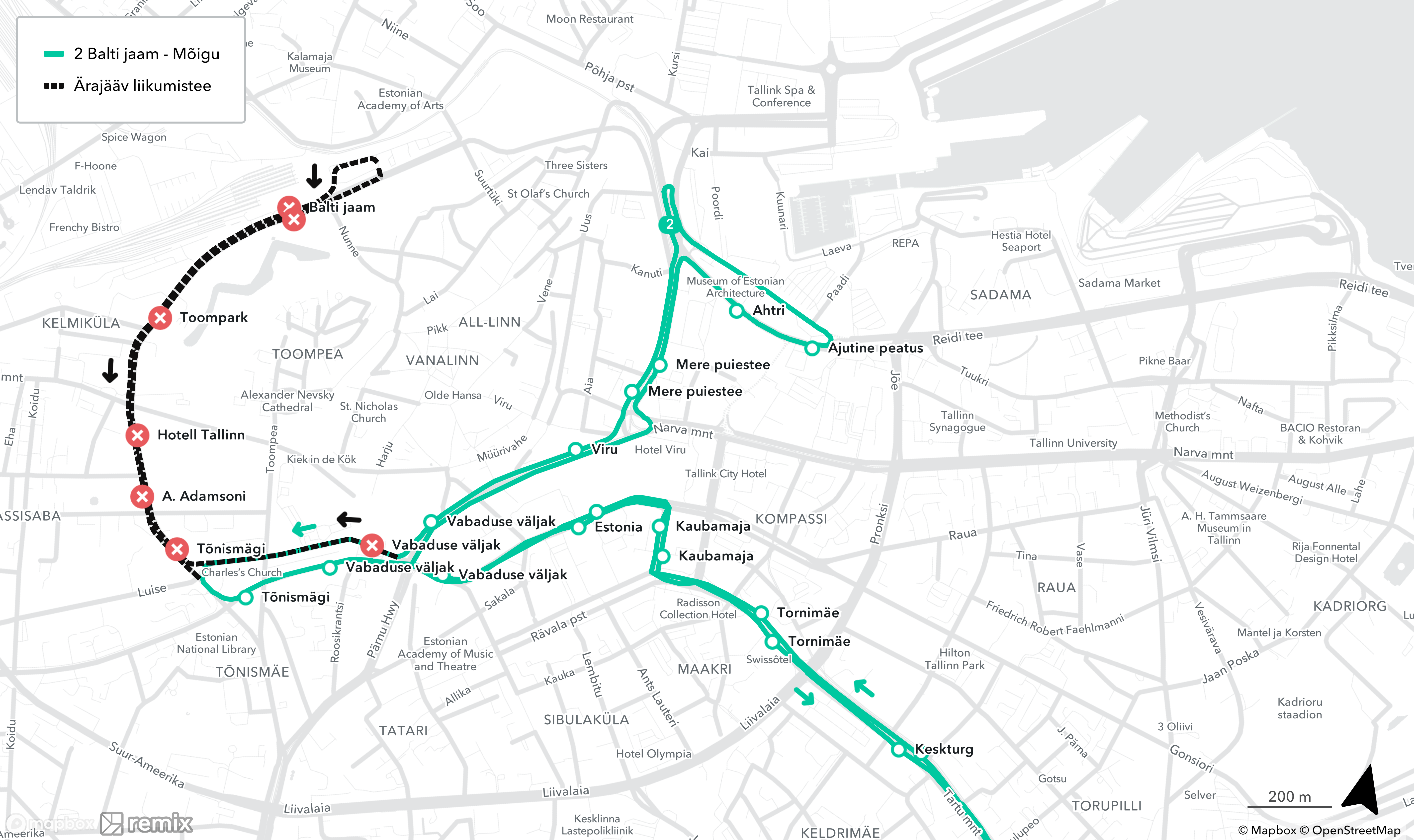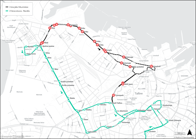 ❌ ära jäävad peatused Balti jaama suunal: Koidu, Vabaduse väljak, Tõnismägi, Toompark, Balti jaam
