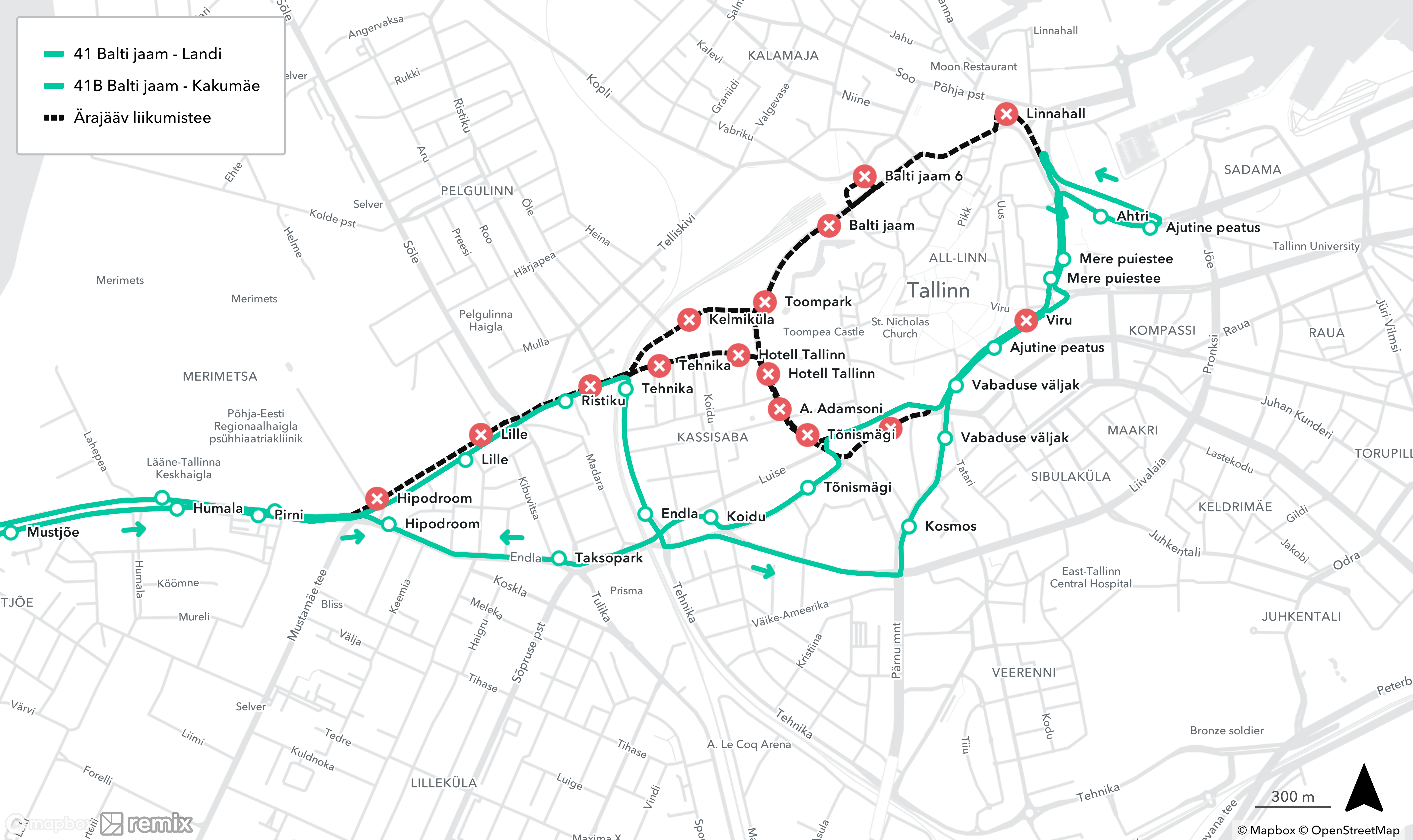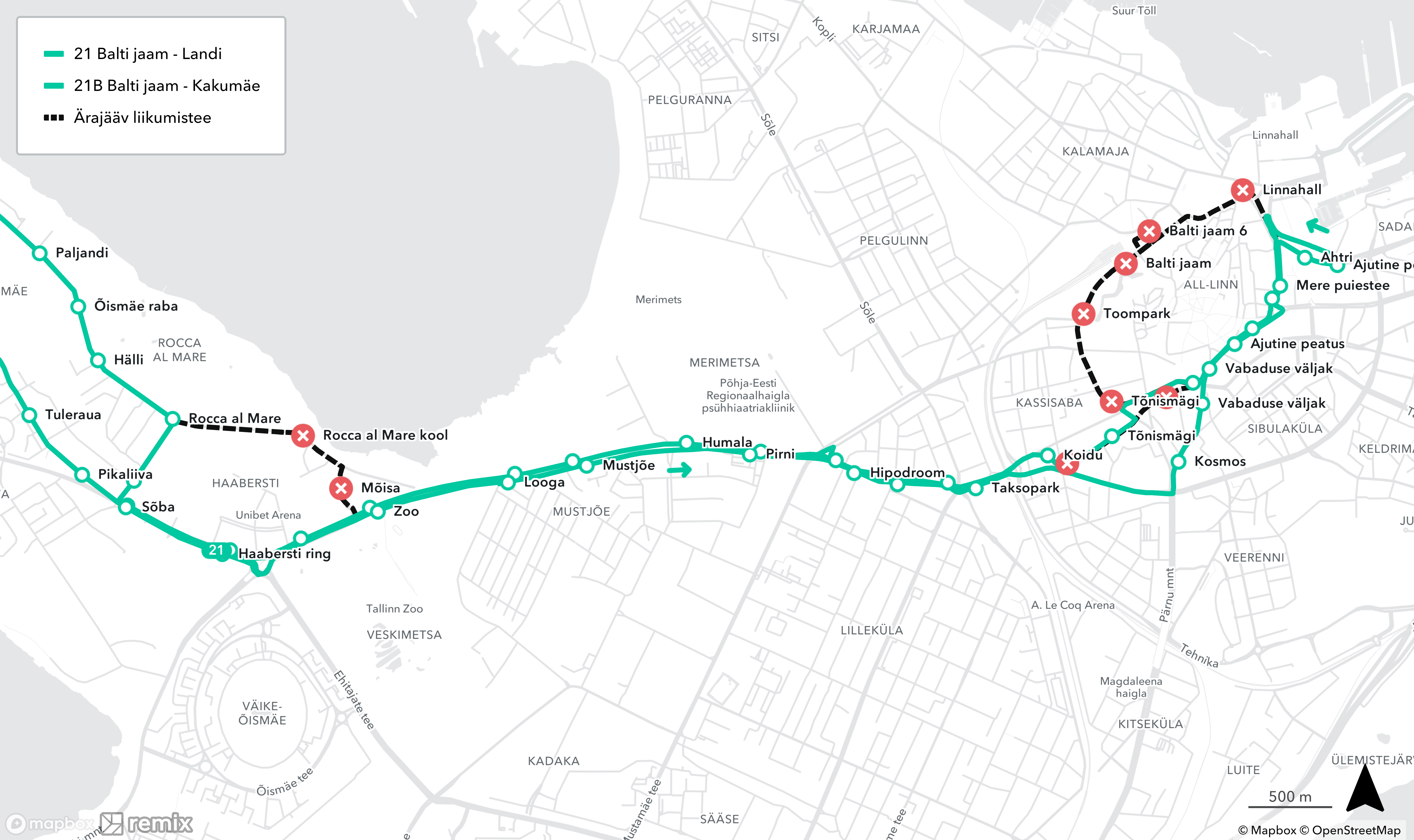 ❌ ära jäävad peatused Landi ja Kakumäe suunal: Balti jaam, Linnahall, Mõisa, Rocca al Mare kool