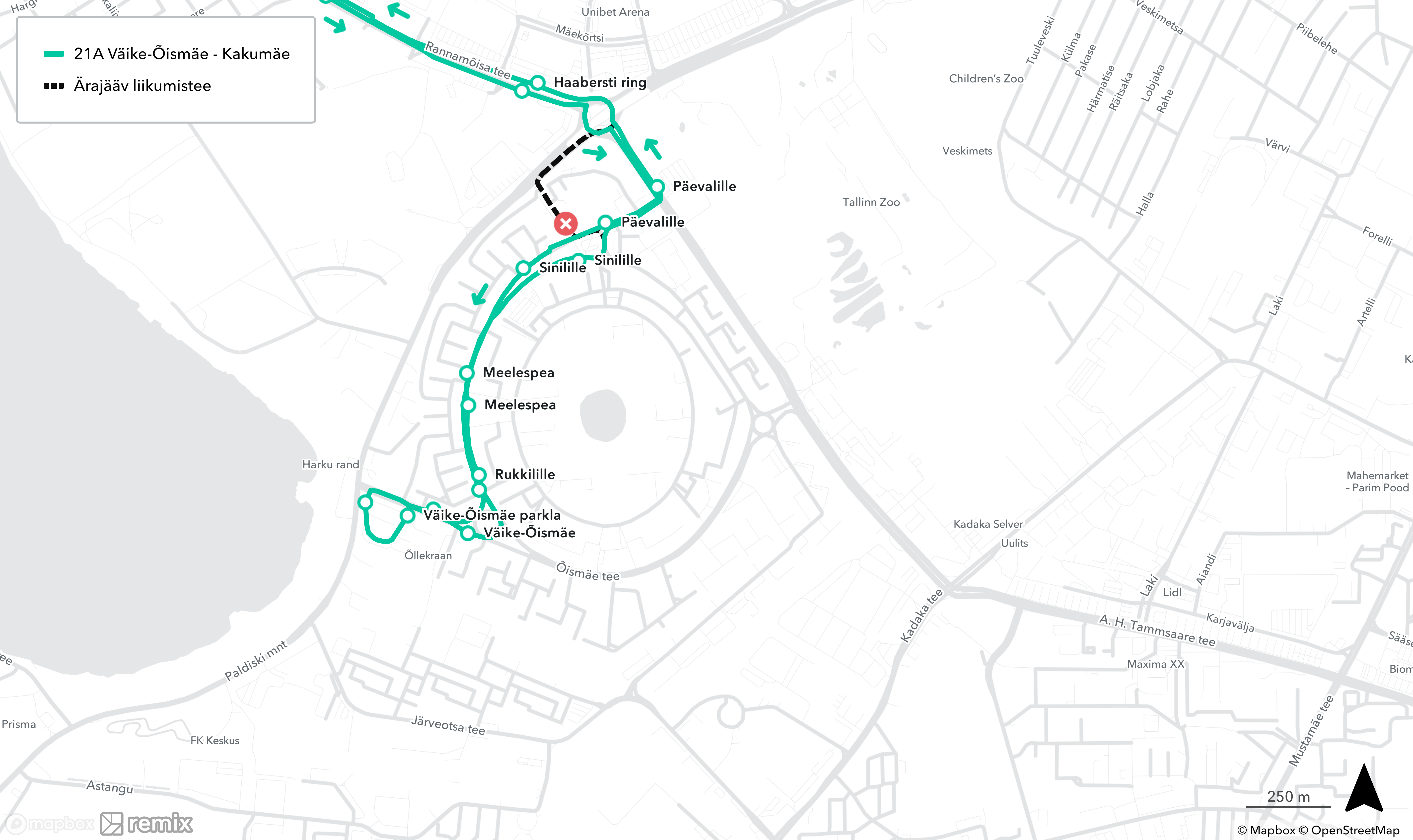 - Tiskre suunal: liikumistee Õismäe tee, Ehitajate tee, Rannamõisa tee, Ehitajate teel tehakse Päevalille peatus
