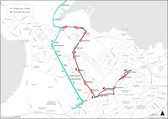 ❌ ära jäävad peatused Balti jaama suunal: Tööstuse, Karjamaa, Erika, Standard, Rukki, Maisi, Härjapea, Pelgulinn, Tehnika, Toompark, Balti jaam