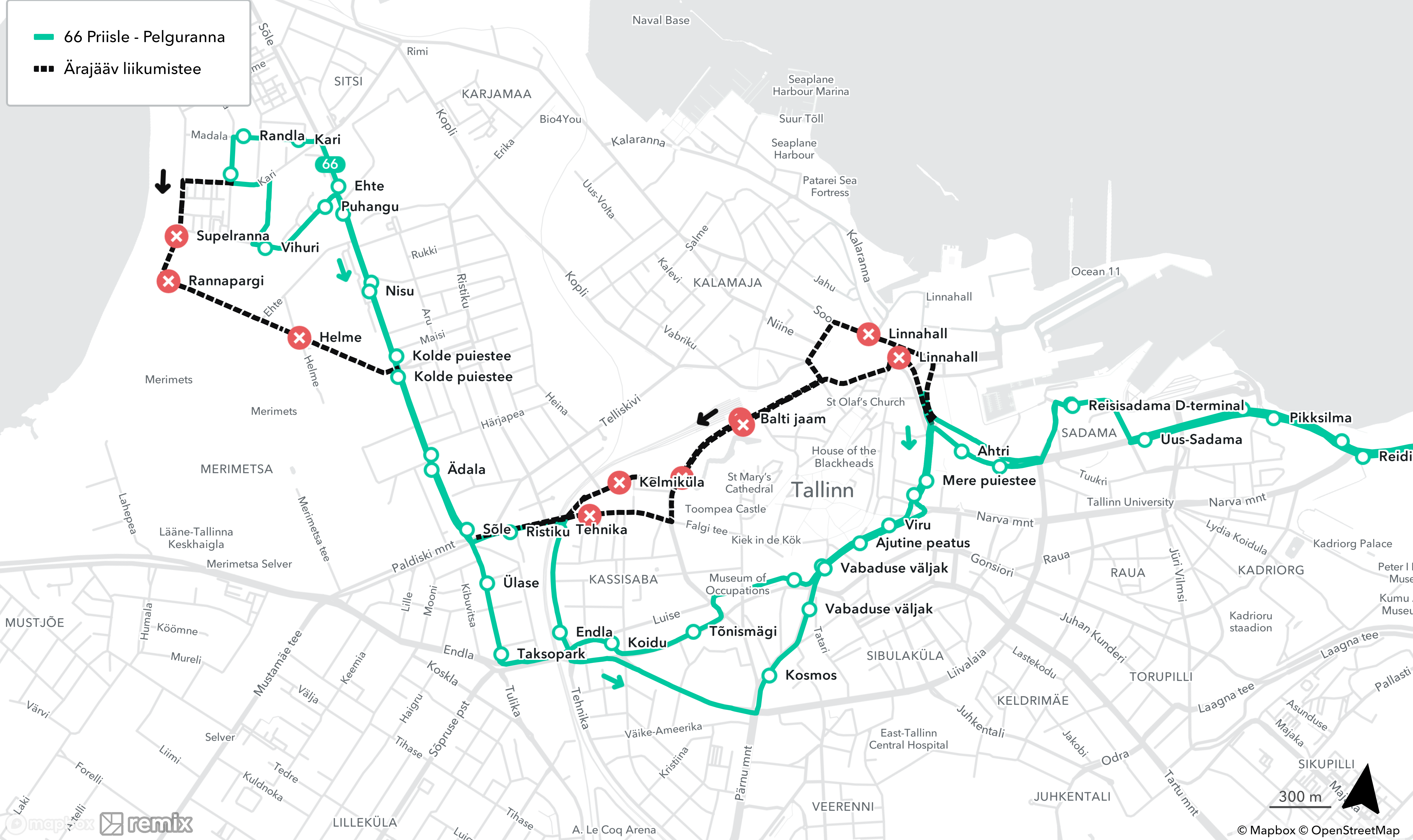 ❌ ära jäävad peatused Priisle suunal: Supelranna, Rannapargi, Helme, Tehnika, Toompark, Balti jaam, Linnahall
