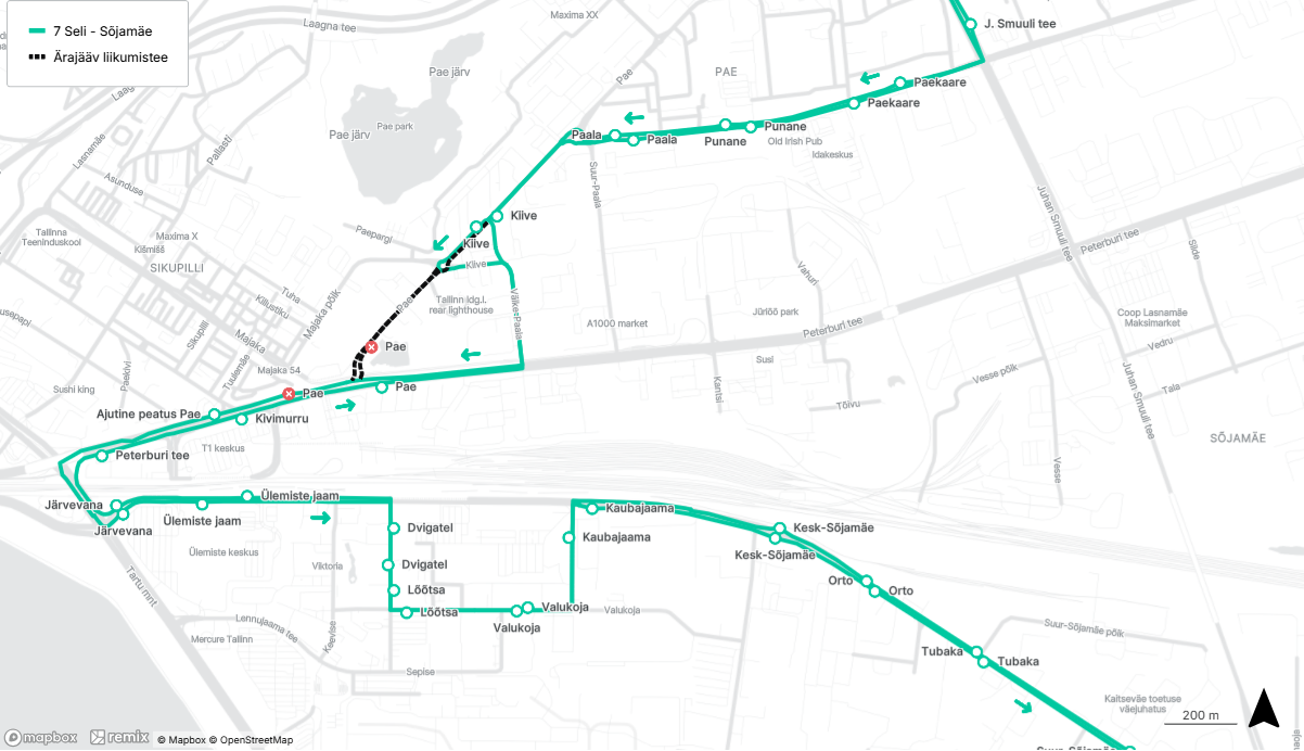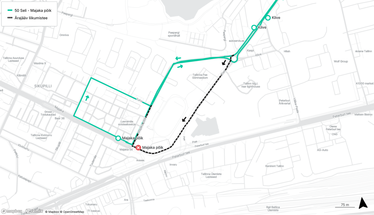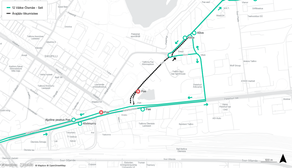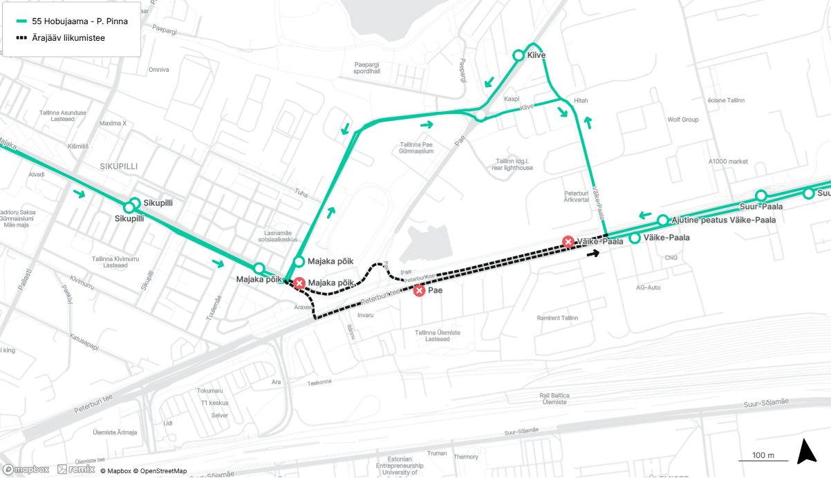 - Väike-Õismäe suunal: tehakse Peterburi teel Väike-Paala peatus ajutises asukohas enne Väike-Paala tänava ristmikku ja Pae peatus ajutises asukohas peale Kivimurru tänava ristmikku