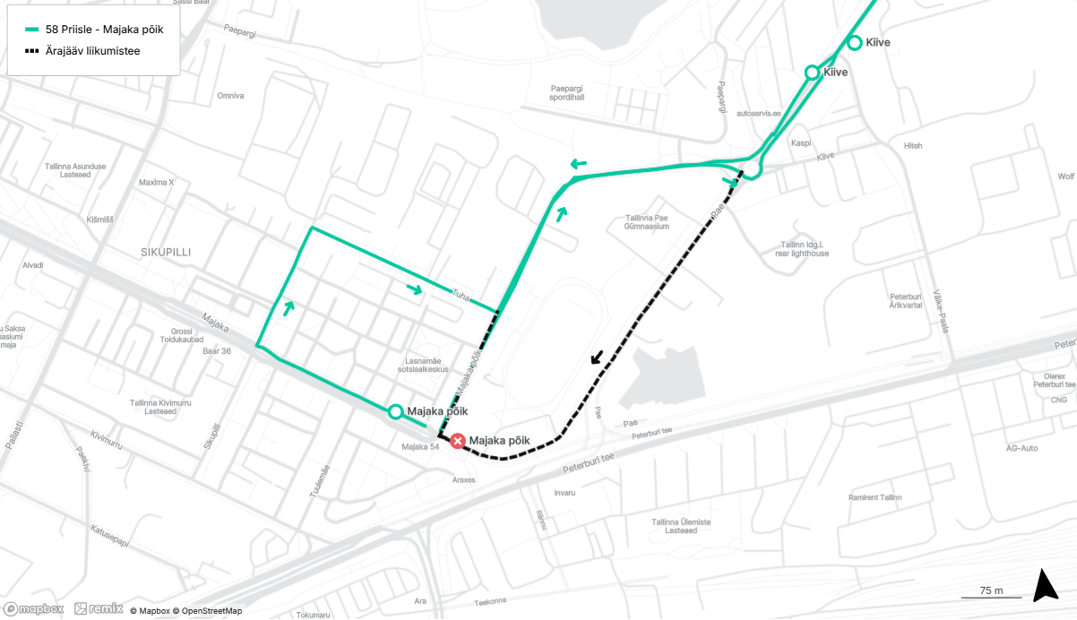 - Väike-Õismäe suunal: Pae tänav, Kiive tänav, Väike-Paala tänav ja Peterburi tee, muudetud liikumisteel tehakse Peterburi teel ajutine peatus Pae peale Kivimurru tänava ristmikku